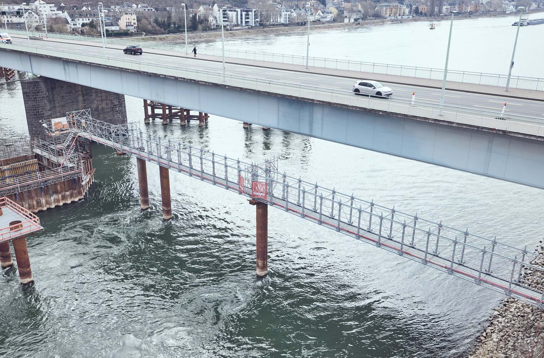 Anstelle der beim Wasserbau üblichen Andienung per Wasser kam beim Bau der Pfaffendorfer Brücke im Hinblick auf Baustelleneffizienz ein temporärer Gerüststeg aus Allround Brückenträger und Allround Fachwerkträger zum Einsatz. Durch die hohe Tragfähigkeit und die schnelle Montage aus leichten Einzelbauteilen konnten die Teupe Gerüstprofis die Gerüstkonstruktion für das Bauunternehmen Fritz Meyer wirtschaftlich errichten – mit nur zwei Mittelstützen als Auflager. Jetzt dient diese als Zugang zu den Spundwandkästen für die Gründung der Fundamente und Betonpfeiler im Rheinbett – sowie als Rettungsweg. Schnelleres Arbeiten, flexiblere Arbeitsabläufe, optimierte Logistik und ein Mehr an Sicherheit auf der Baustelle war das positive Fazit des Projektleiters.