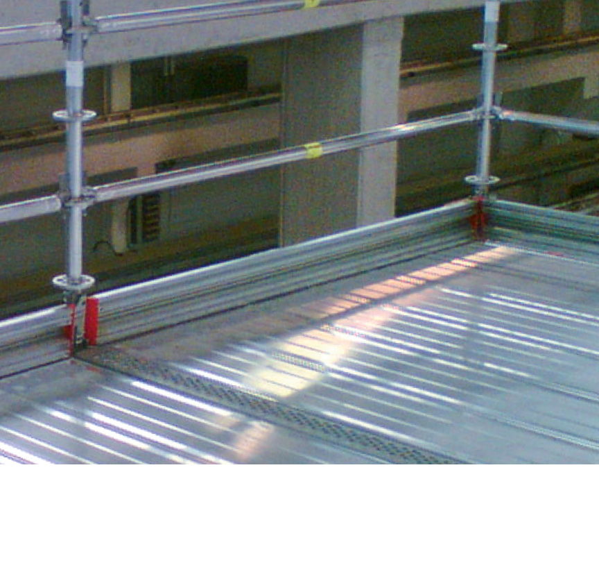 Um die Brandlast, z. B. bei Schweißarbeiten, zu reduzieren, kann mit Layher Gerüstsystemen vollständig auf Holz verzichtet werden.